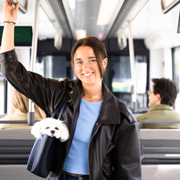 Bring small dogs and other small pets for free if they are transported in a bag, crate or cage for the entire journey. Dogs on a leash or in carriages must have their own ticket.